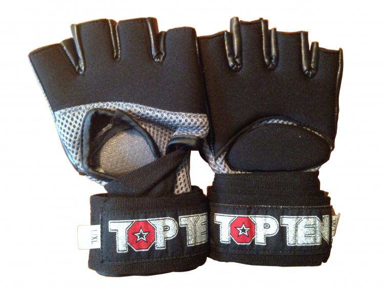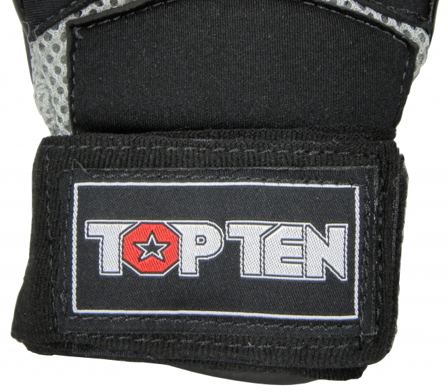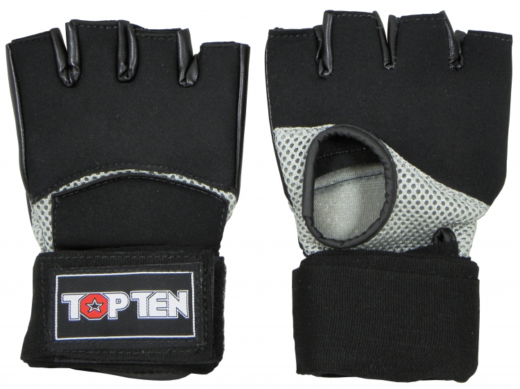 Żelowe bandaże firmy TOP TEN do osłony na kostki dłoni zastępujące tradycyjne owijki. Do stosowania pod rękawice bokserskie. Łatwe w użyciu – szybsze i prostsze zakładanie w porównaniu ze zwykłymi bandażami. Wkładka żelowa chroni kostki i śródręcza dłoni zawodnika przed kontuzjami, a elastyczna taśma służy do usztywnienia nadgarstka.