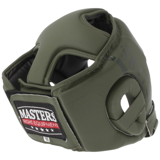 Turniejowy kask KTOP-PU-MATT z zabudowaną górą głowy, przeznaczony do treningów i zawodów. Wykonany z syntetycznej zielonej skóry w matowym wykończeniu z przyciagającym wzrok błyszczącym nadrukiem.