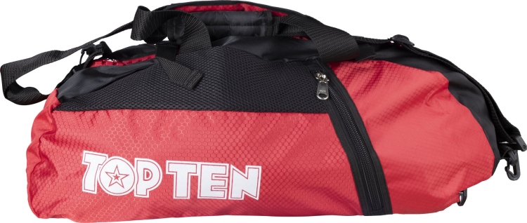 Multi funkcjonalna torba sportowa TOP TEN. Solidnie wykonana z poliestru. Pojemna, funkcjonalna i wygodna. Odpinany, regulowany pas na ramię z antypoślizgową nakładką. Ponadto posiada dwa mniejsze paski do noszenia w dłoni. Można ją dodatkowo zabezpieczyć zapinając na dwie klamry u góry torby.Posiada 2 zewnętrzne kieszenie zapinane na suwak po bokach torby. Gruby i trwały suwak zapewni długą żywotność torby. Idealna na trening jak i wyjazdy. Torbę można nosić jak plecak, dzięki regulowanym paskom wpinanym na spodzie torby (można je odpiąć i schować w kieszeni zewnętrznej na spodzie).